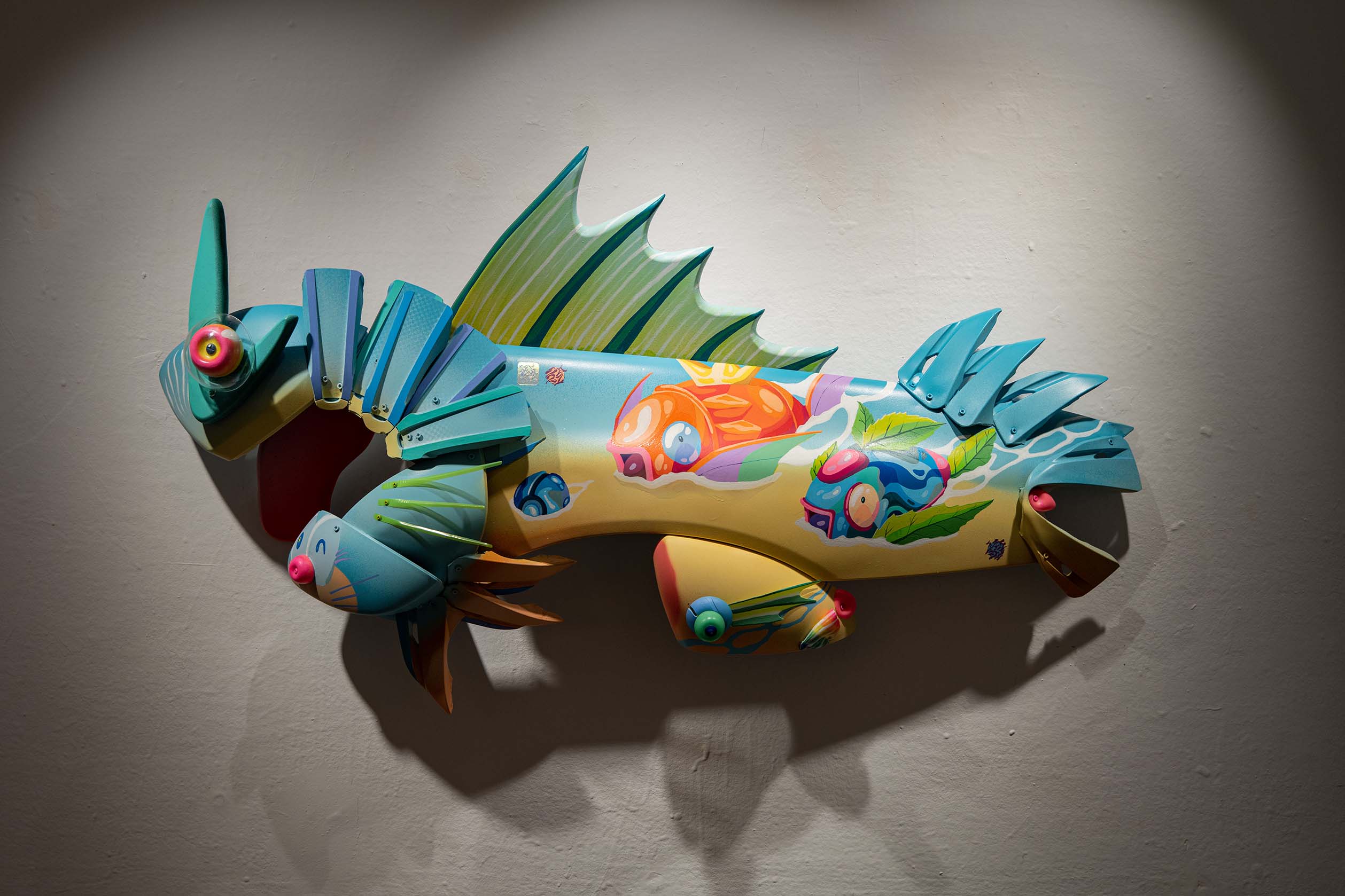 The subject of biogenesis is directly related to his personal evolution: “It is directly related to the birth of my daughter in 2017. From there, I decided to create a character in this new dimension in which everything levitates, where earth, air and water mix.” “That’s when I started to study the concept of evolution and that led me to investigate Japanese characters and their background, to try to give them a spiritual meaning.” Similarly, the incorporation of Japanese cartoon characters into his work brings a pop component to his creations that ends up also engaging us in an introspection about our own childhood and evolution.