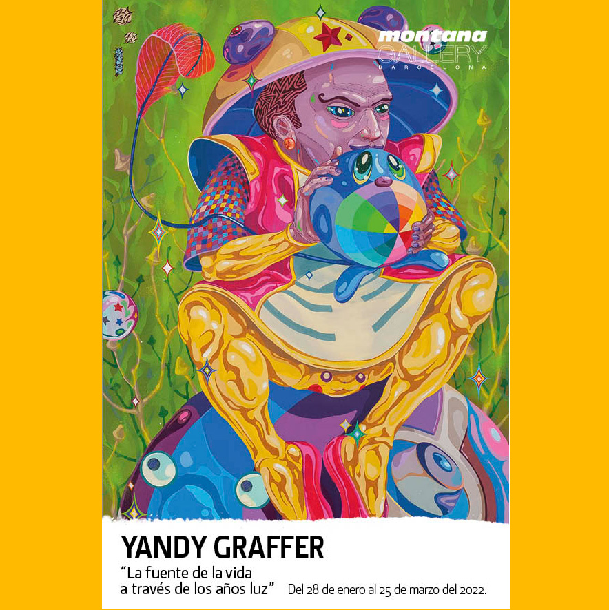 The exhibition, titled “La fuente de la vida a través de los años luz“, addresses a recurring theme in Yandy Graffer’s current production: the evolution of life and the human race from her perspective. A series of symbolic elements ranging from seeds to cartoon characters, fish and even fruit, are used to communicate a spiritual reflection on the evolution of life.