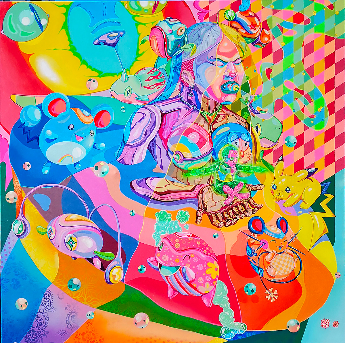 Le sujet de la biogenèse est directement lié à son évolution personnelle : « C’est directement lié à la naissance de ma fille en 2017. À partir de là, j’ai décidé de créer un personnage dans cette nouvelle dimension dans laquelle tout lévite, où la terre, l’air et l’eau se mélangent ». « C’est à ce moment-là que j’ai commencé à étudier le concept d’évolution et cela m’a conduit à enquêter sur les personnages japonais et leur contexte, pour essayer de leur donner un sens spirituel”. De même, l’incorporation de personnages de dessins animés japonais dans son travail apporte une composante pop à ses créations qui finit par nous faire participer aussi à une introspection sur notre propre enfance et évolution.